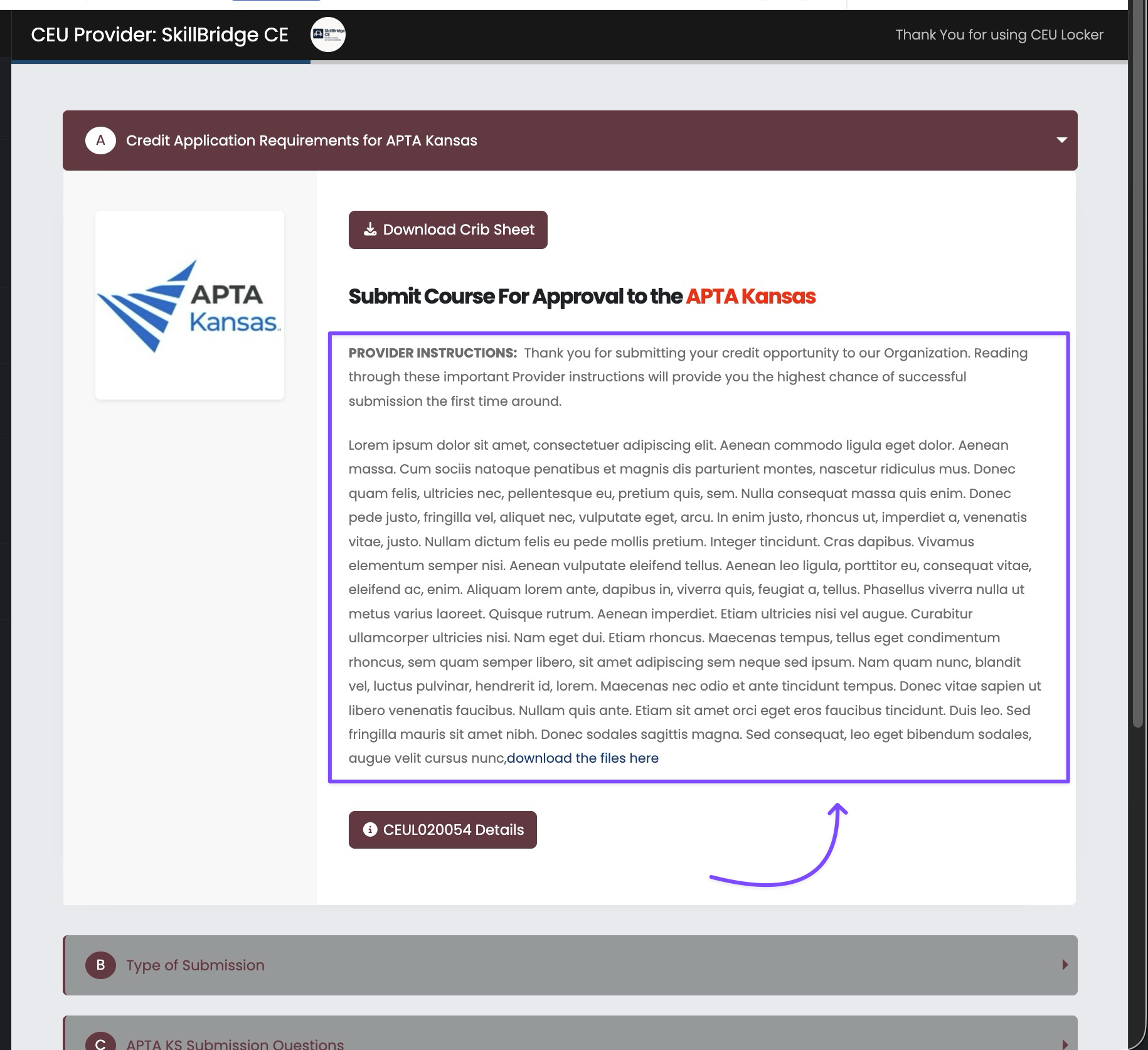 Crib sheets in CEU Locker are instructional PDFs, that YOUR organizations can upload into your Admin panel, in order to educate CEU Providers, CEU Holders, and your CEU Reviewers on how to be successful in your CEU Locker platform. These downloadable ...