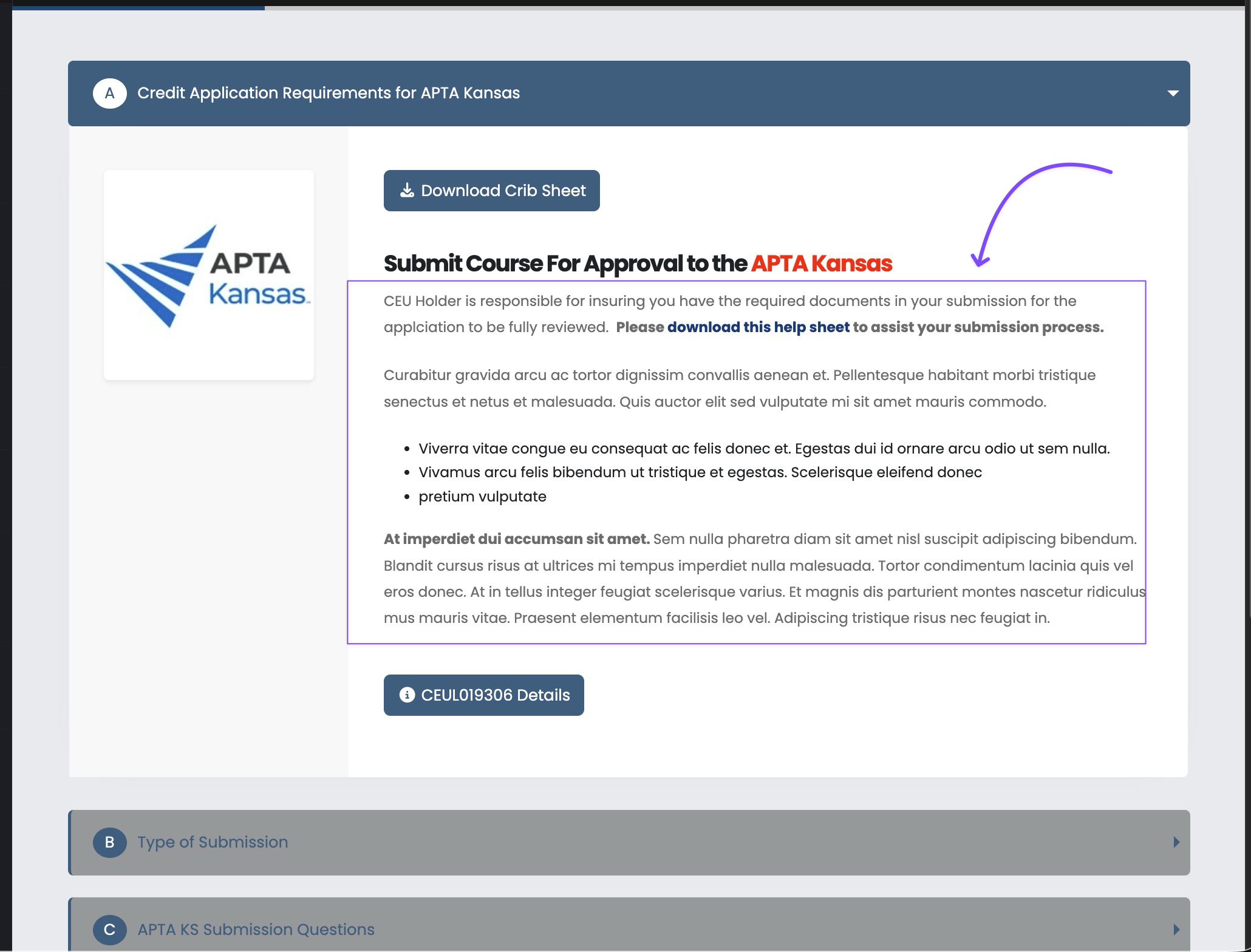 Text entered in this area will appear at the top of the CEU Holders submission application form. Critical information to include in this area: