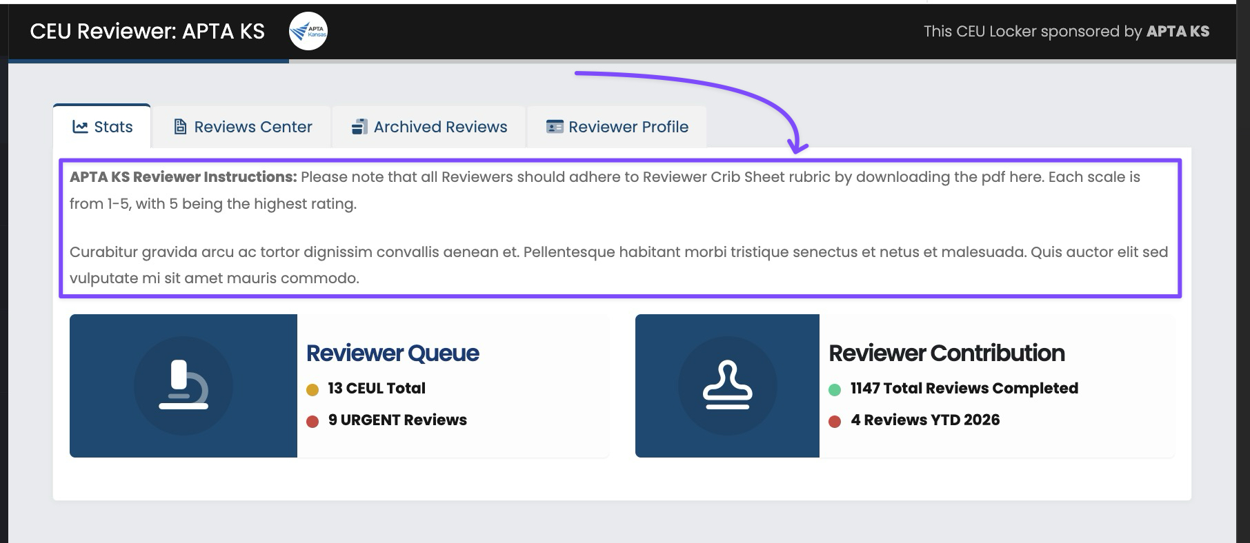 Text entered in this area will appear at the top of the dashboard for Reviewers in your platform. Critical information to include in this area: