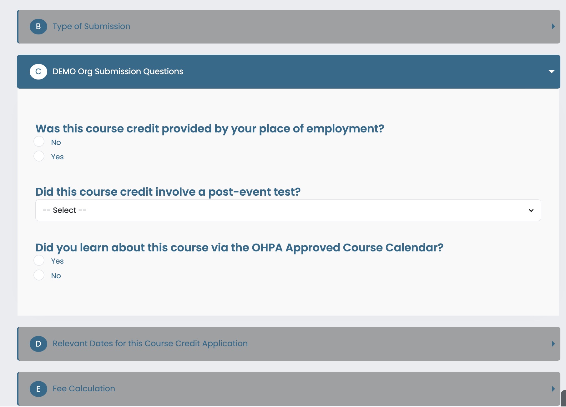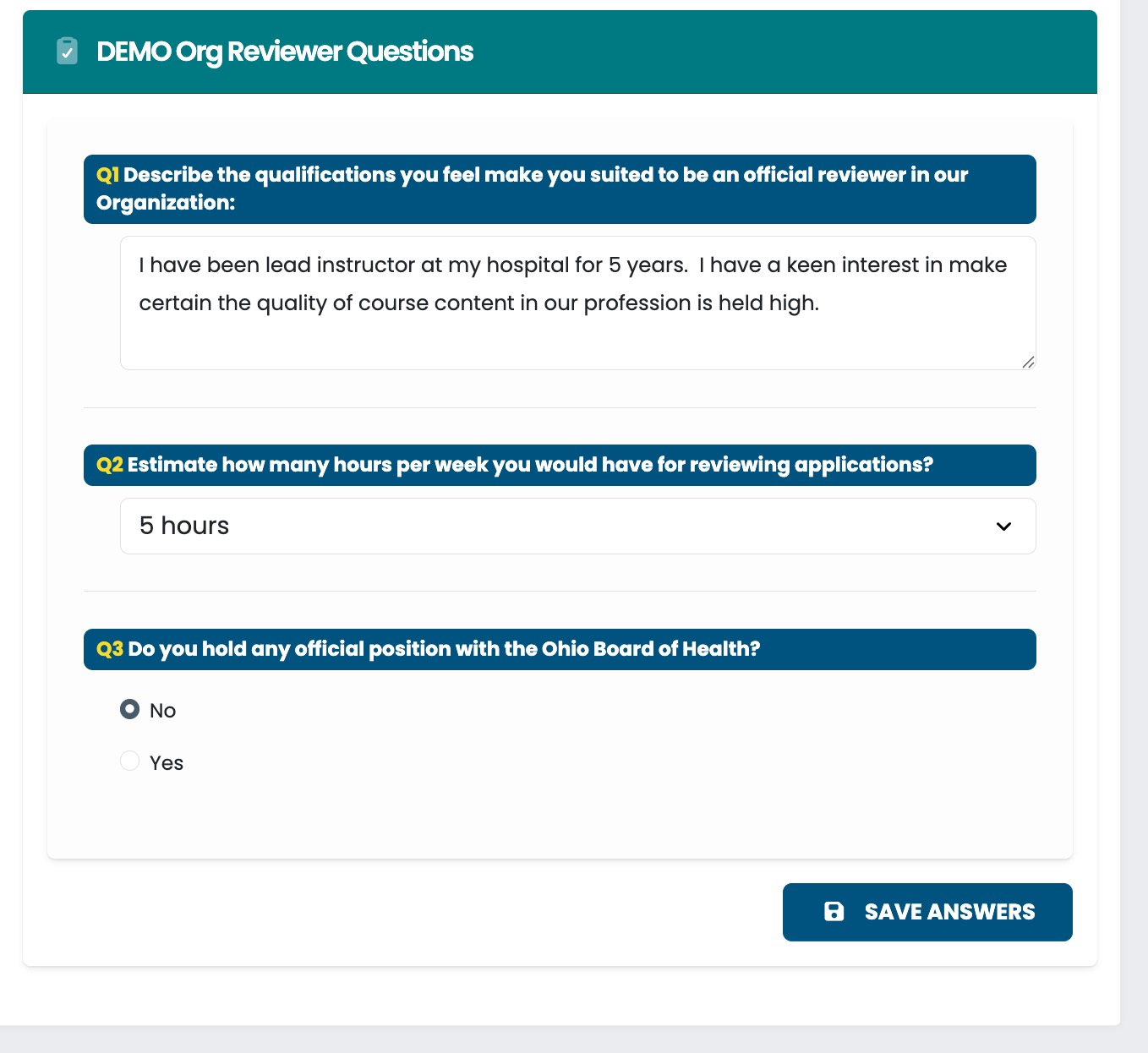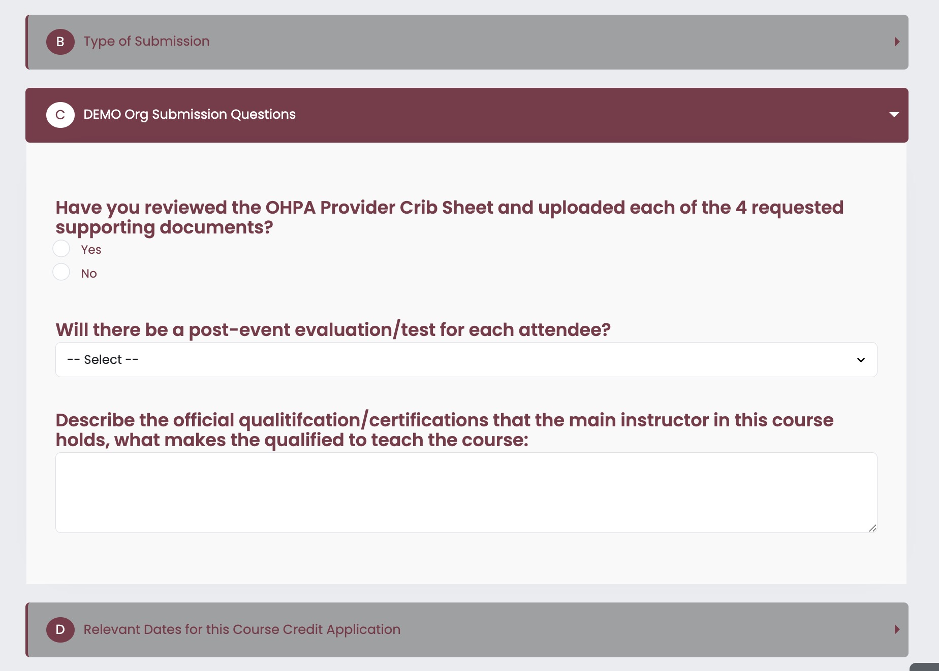 These questions appear when a CEU Holder is submitting their course credit application into your system (if allowed). The answers to these required questions in the submission pathway will appear for administrators and reviewers to inspect the answers.