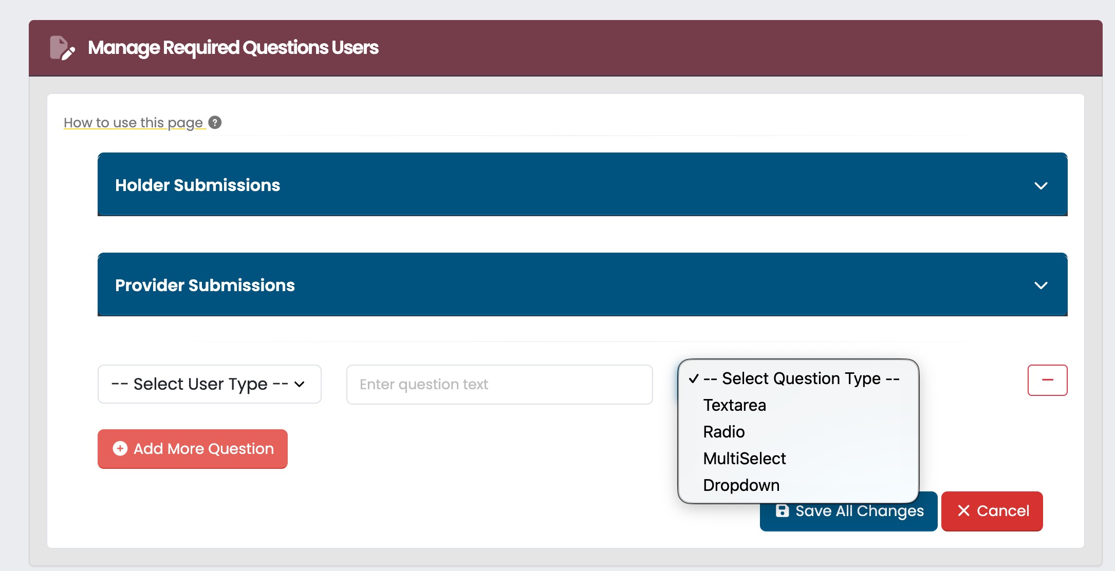 In your Organizations Admin Settings page, there is a panel for a managing questions you require from your users. The questions established can target 4 types of users in your system: CEU Holders creating new accounts connected to your organization, CEU Holders submitting applications for approval into your system (if allowed), CEU Providers submitting applications into your system, or registered Users that wish to apply to be an official Reviewer in your system.