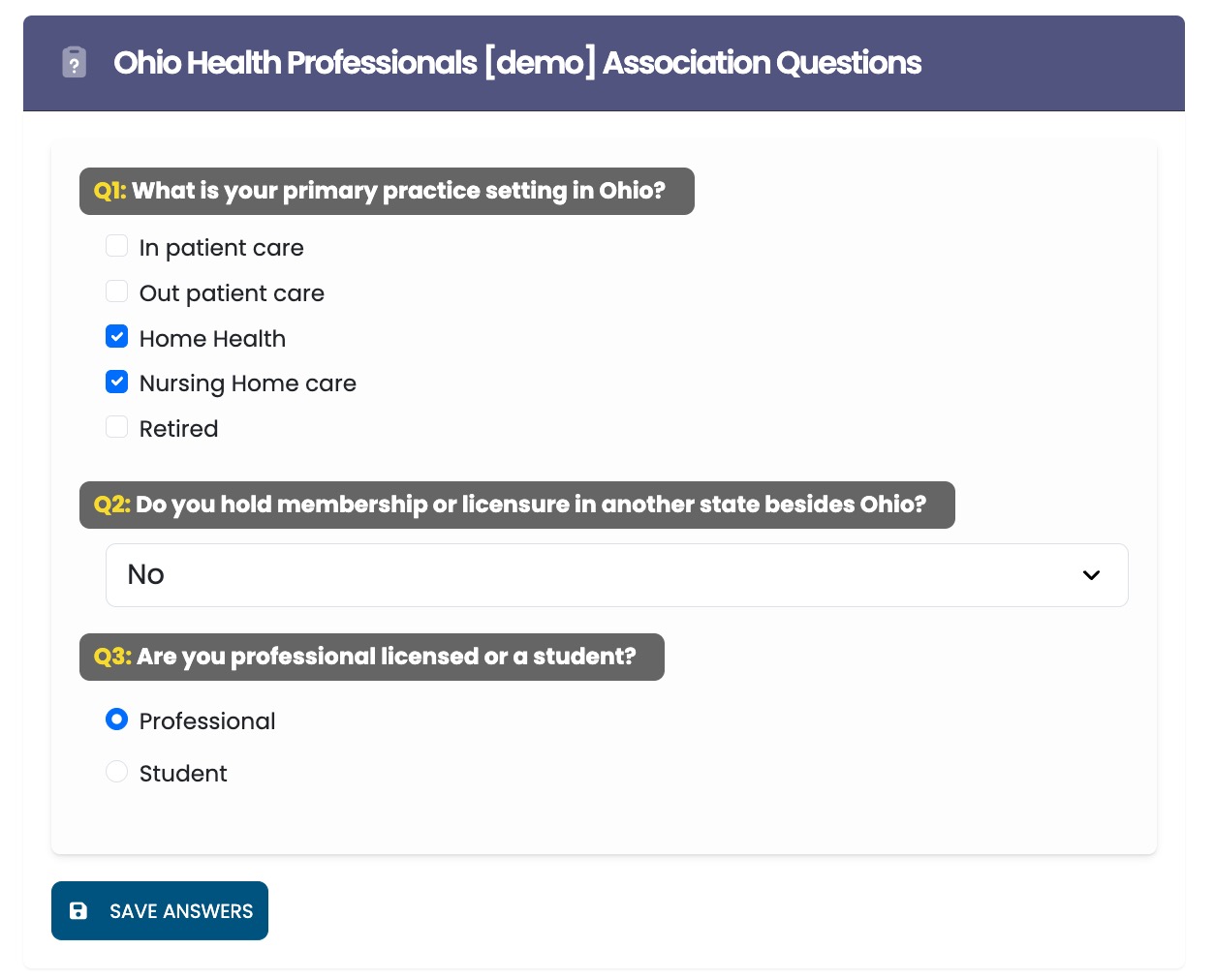 These questions appear when a user is trying to make a CEU Holder connection to your Organization. In order to complete the connection, they must answer the questions created. Here is an example question list for the Demo Association: